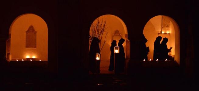 Führungen in den frühen Abendstunden sind ein besonderes Erlebnis. Wenn gedimmte Kristalllüster zu funkeln beginnen und Hunderte von Kerzen ein warmes Licht verbreiten, werden Mittelalter und Barock in den 800 Jahre alten Gemäuern wieder lebendig. Allein 400 Teelichter erleuchten den romanischen Kreuzgang aus dem 12. Jahrhundert. Gregorianische Choräle intoniert die „Schola Cantorum Berchtesgadensis‟. Die Harfenistin Maria Petersen und das Flötenensemble „Flauto Dolce‟ erwarten die Gäste in historischen Kostümen.