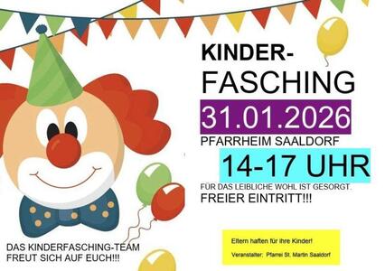 Wie in jedem Jahr findet am 31.01.26, von 14 Uhr bis 17 Uhr, der beliebte Kinderfasching im Pfarrheim in Saaldorf statt.
